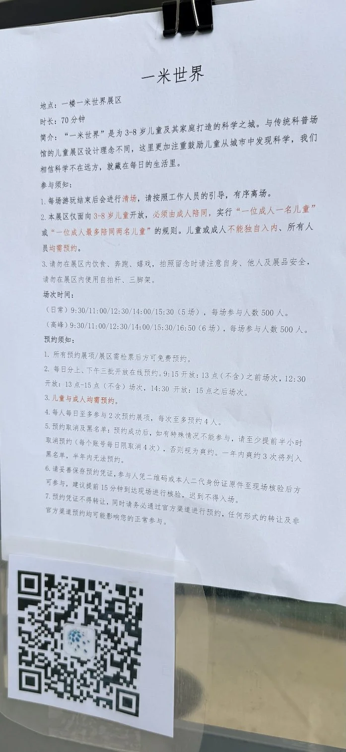 Use WeChat and scan the QR code to access the booking link ← . Only works when open in WeChat (click the checkbox to agree to the T&C). Use the Translate function (3 dots on the top right corner). If you have children aged 3–8, Mini World is an absolute must-visit. Ask staff on-site to reserve spots after entry. The entrance is timed just like going to the cinema, each section is 70 min, the mini world is designed for kids aged 3-8 years old and must be accompany by 1 adult, each adult can maximum accompany 2 children.