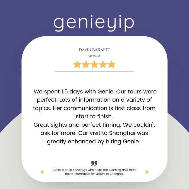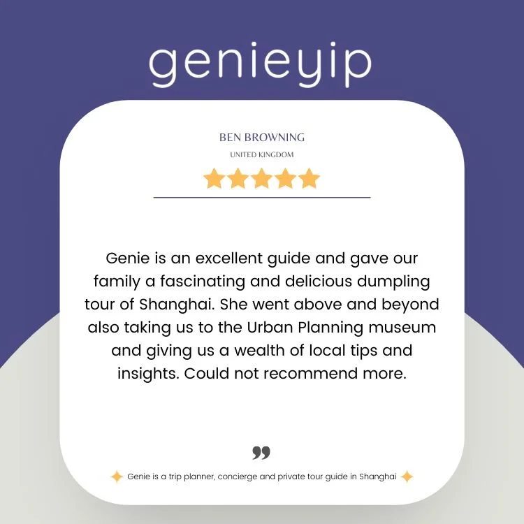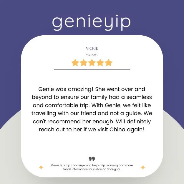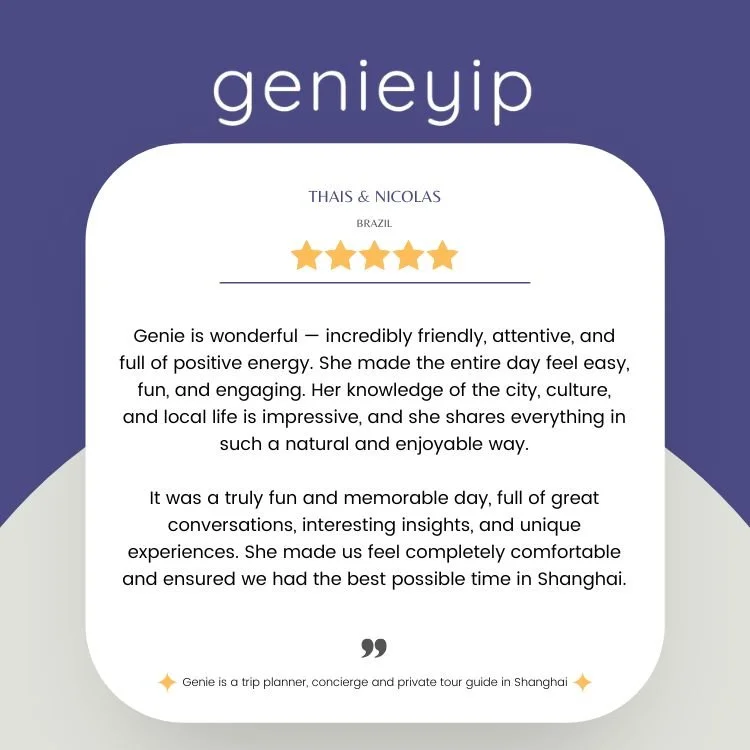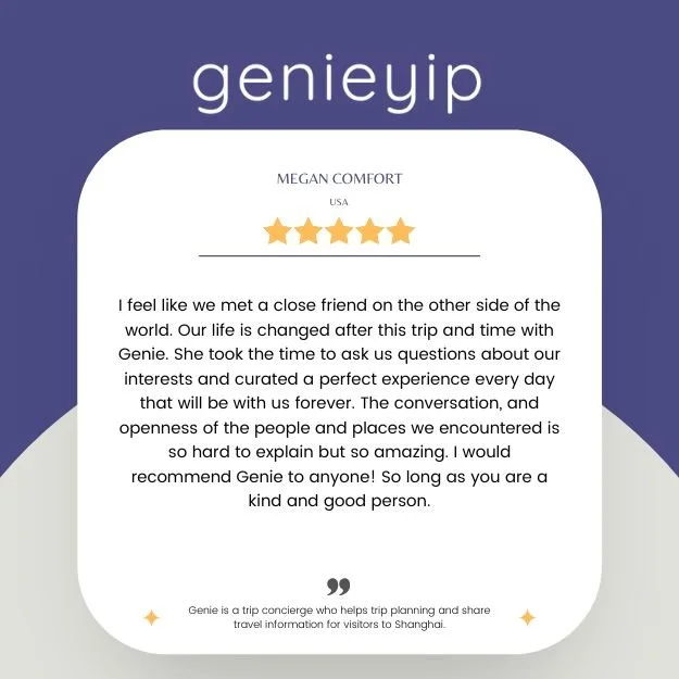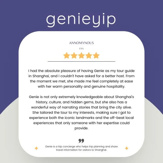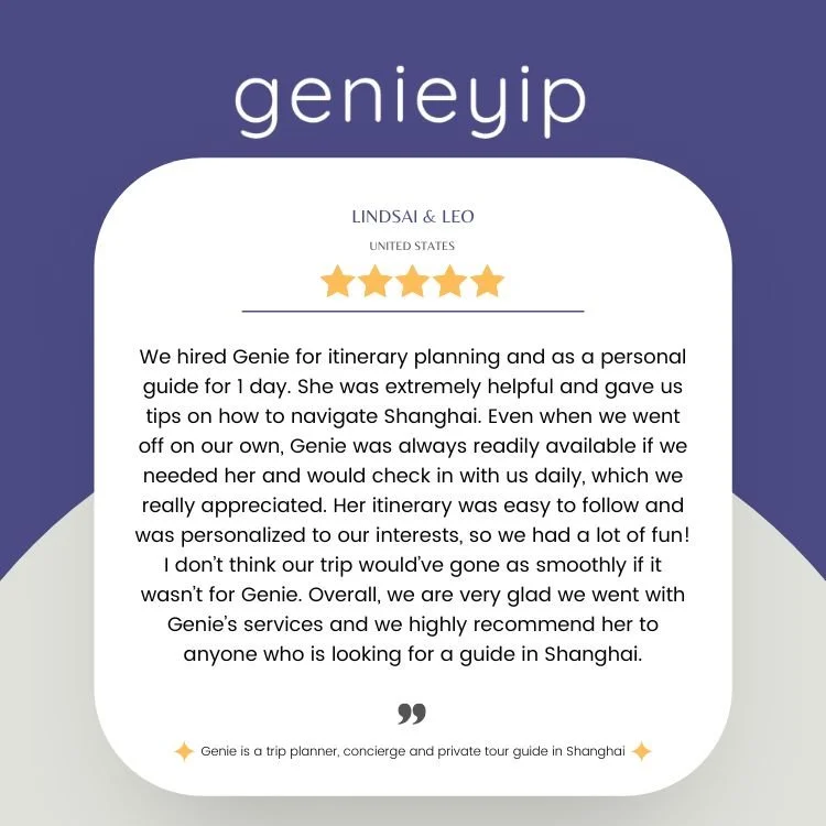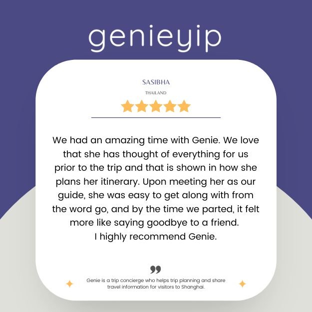 “Genie provides a bespoke and absolutely personalized guidance and tour to enjoy and immerse yourself in a Shanghai. She takes care of all the logistics and planning- you just need to tell her your likes, wishes and she will make it happen! Highly highly recommend her!”